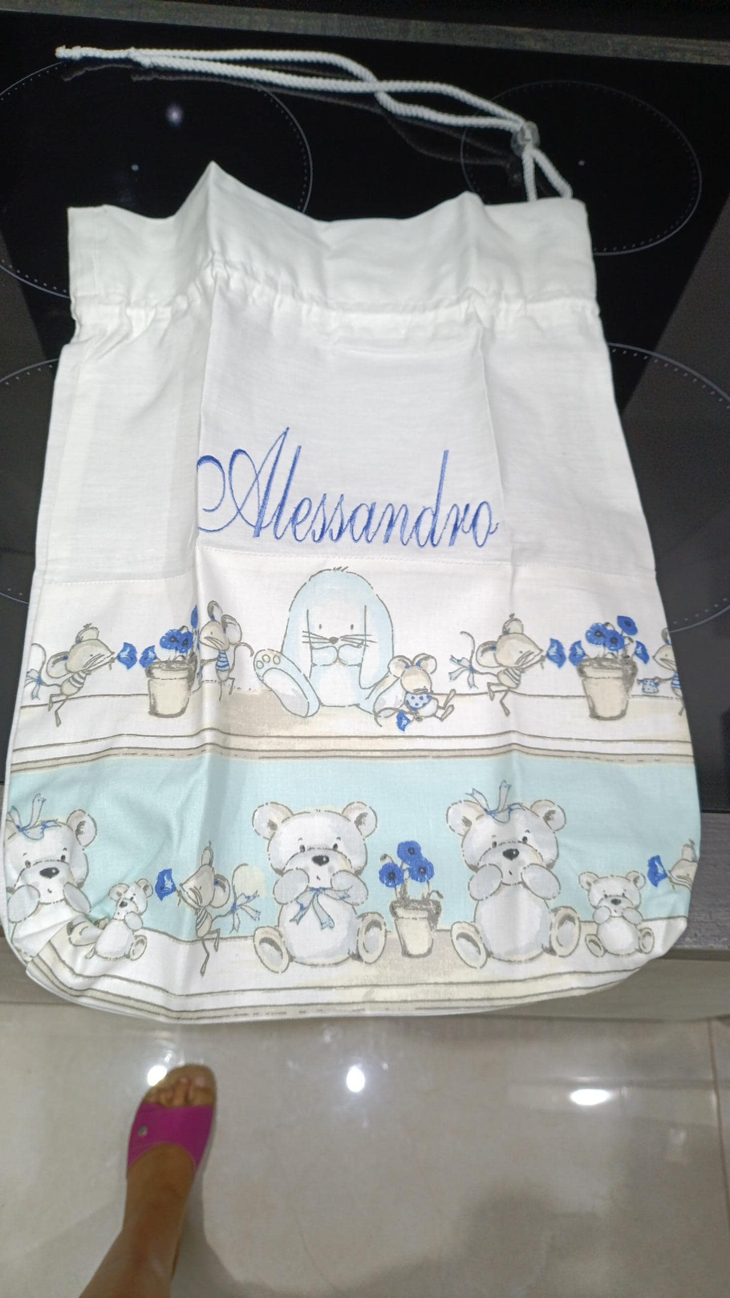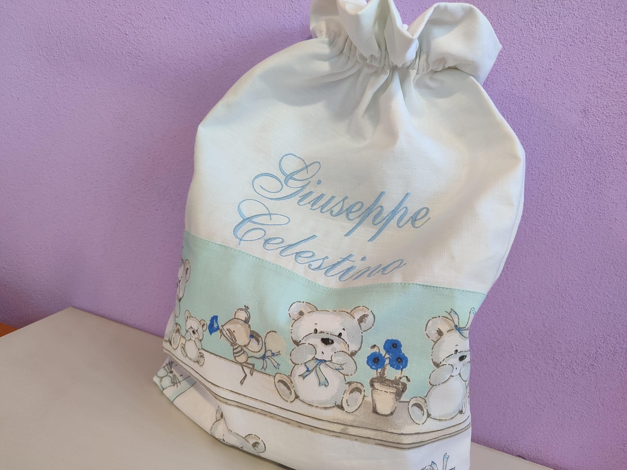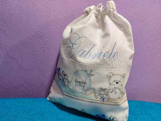 Linen and cotton fabric bag with machine embroidered name.