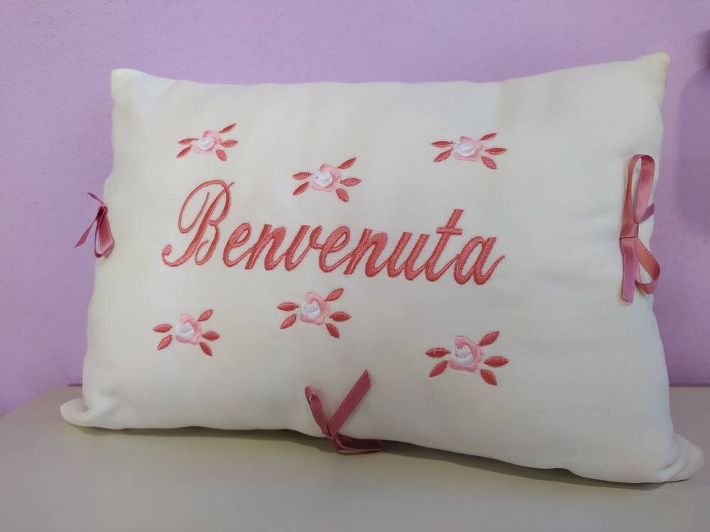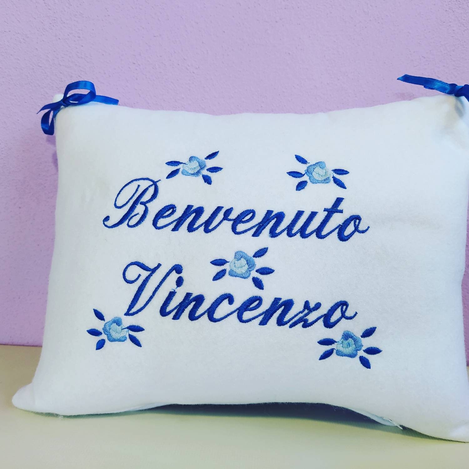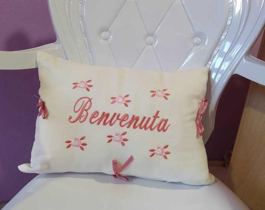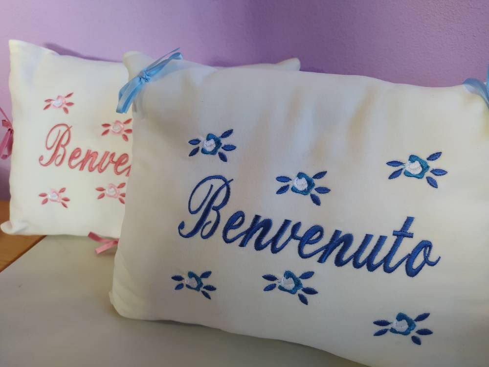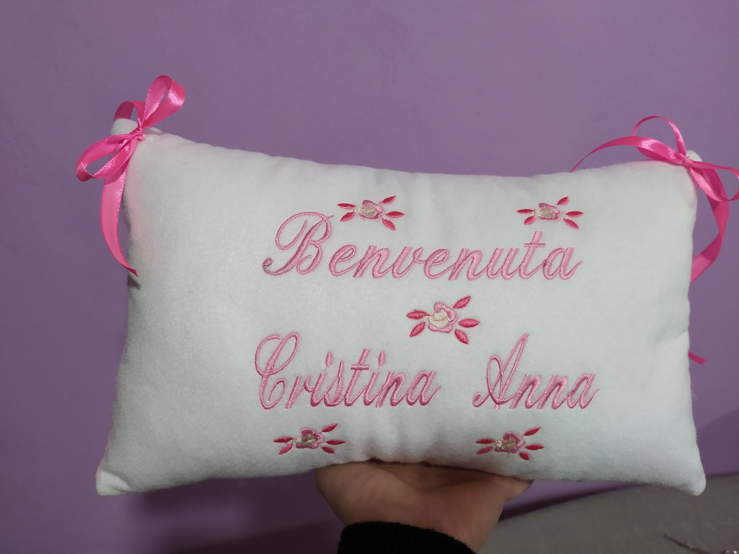 Delightful personalized birth pillow, made entirely by hand in white felt with machine embroidery in pink or blue.