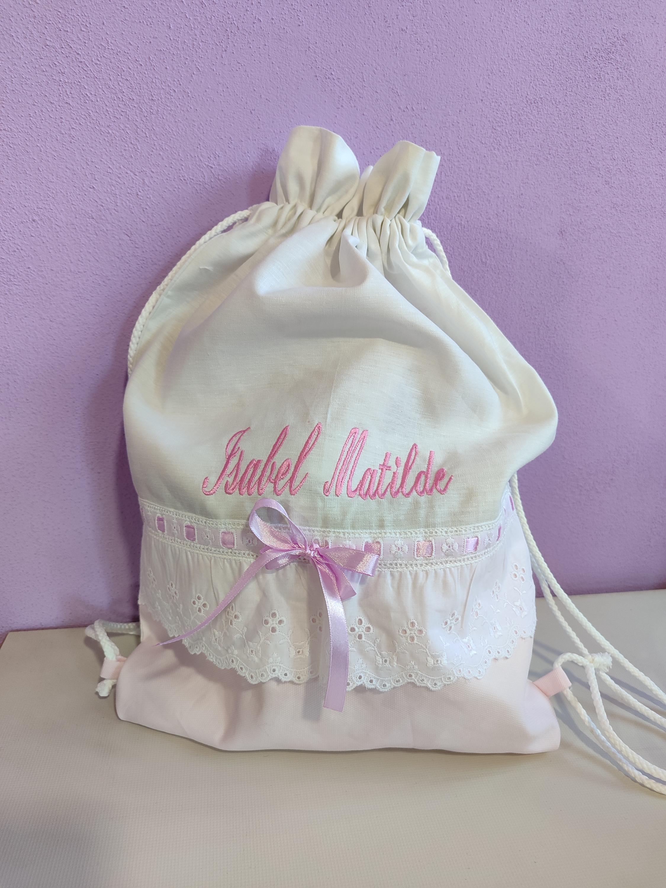 The bag has an elegant San Gallo lace decoration with the same satin ribbon inserted to match the embroidery.