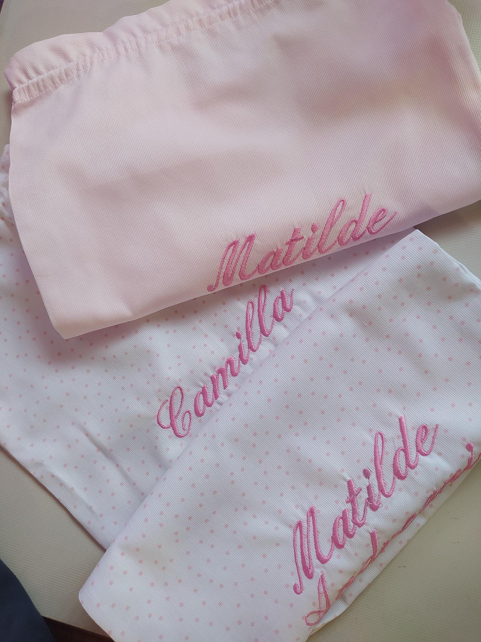 Romantic cursive writing, made in light blue on light blue, in dark pink on pink and personalized on the white bag.