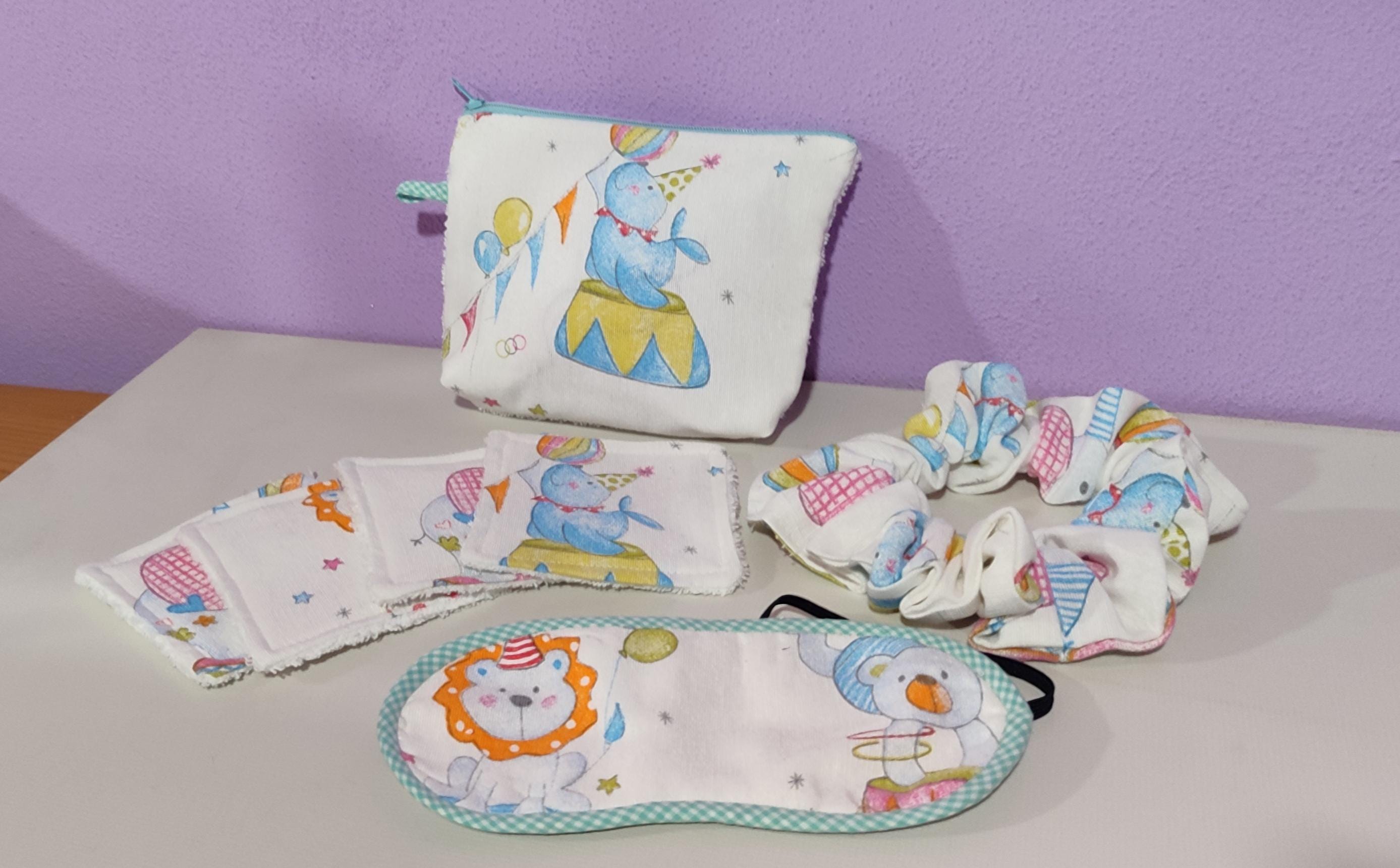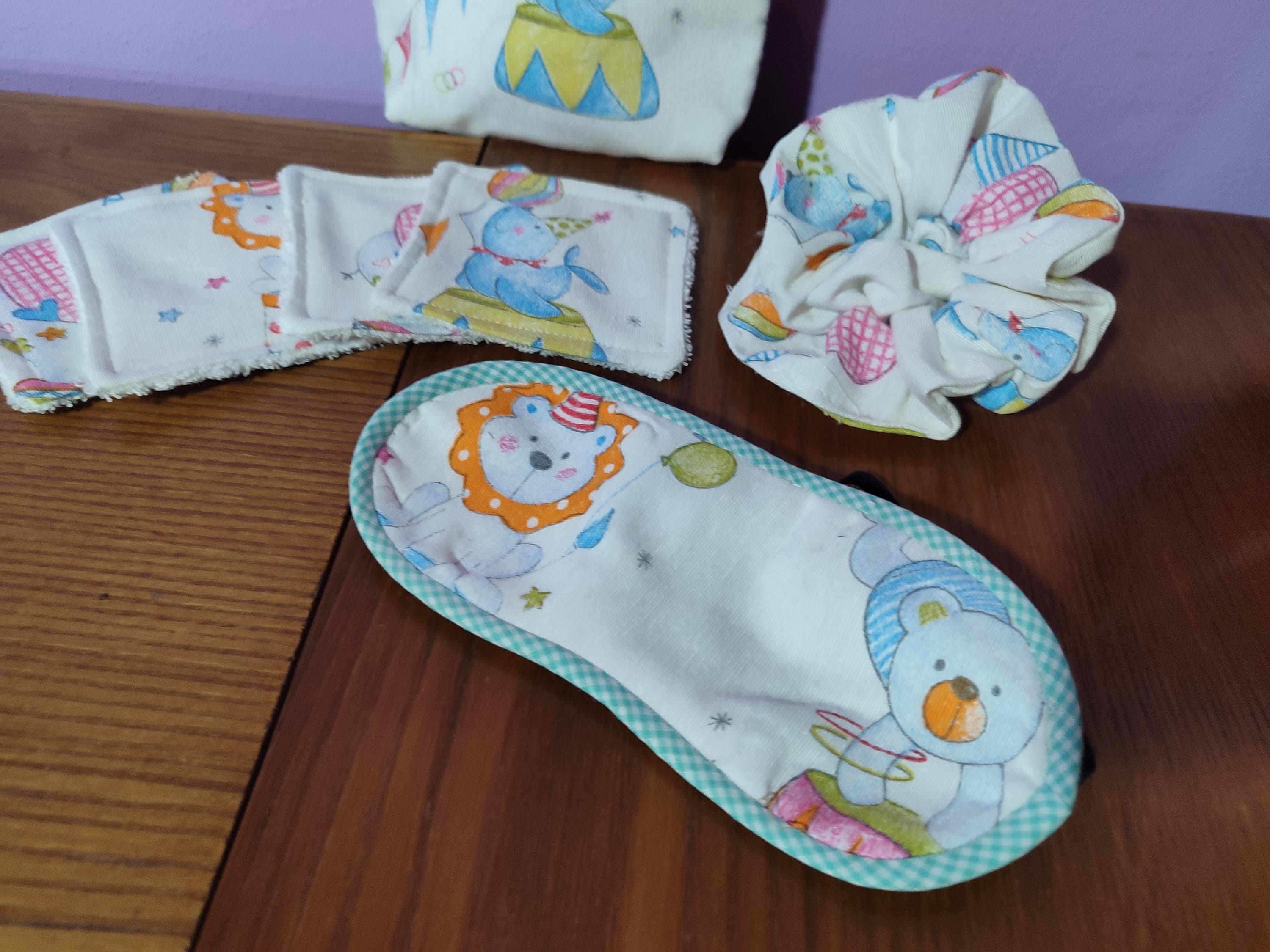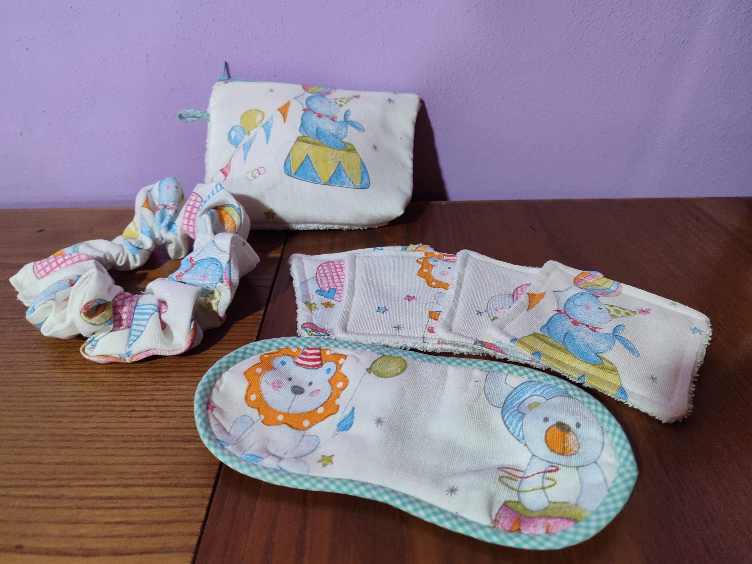 Perfect for pajama parties, trips, weekend getaways, or simply for eco-friendly, comfortable, and super-cheerful accessories, thanks to the colorful pattern featuring cute circus animals.
